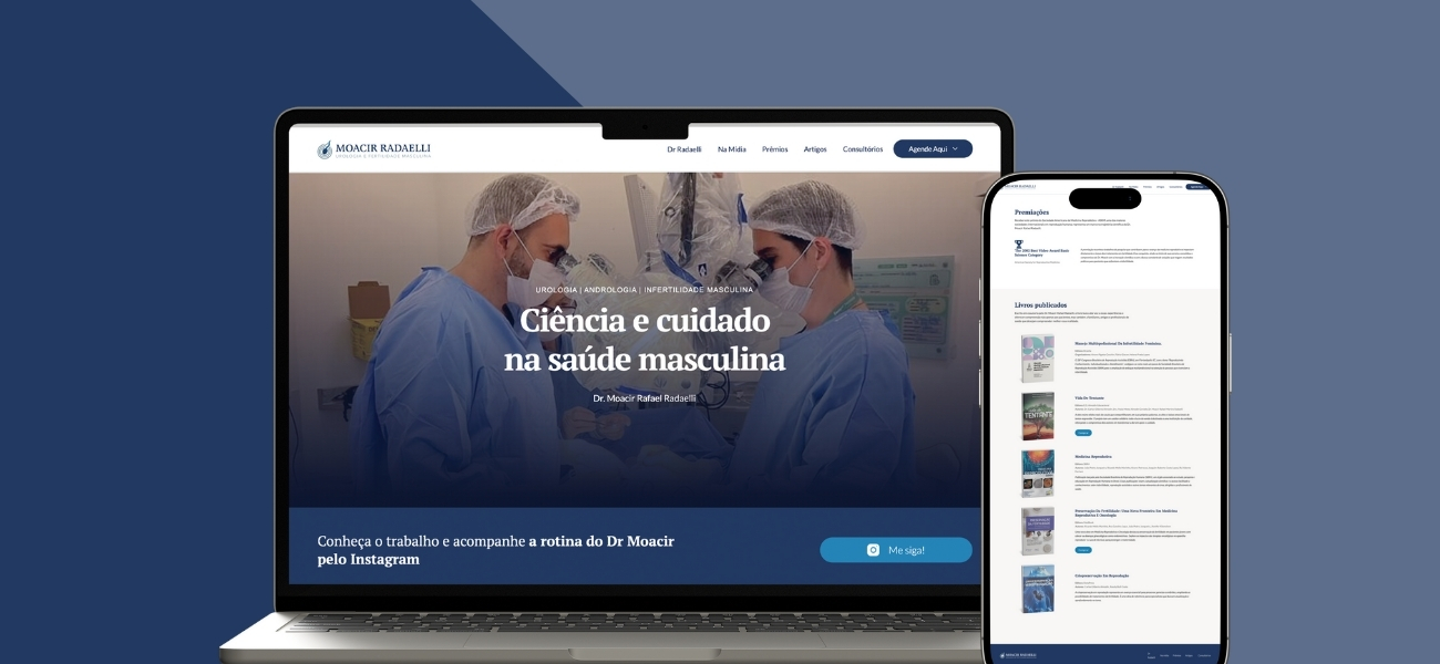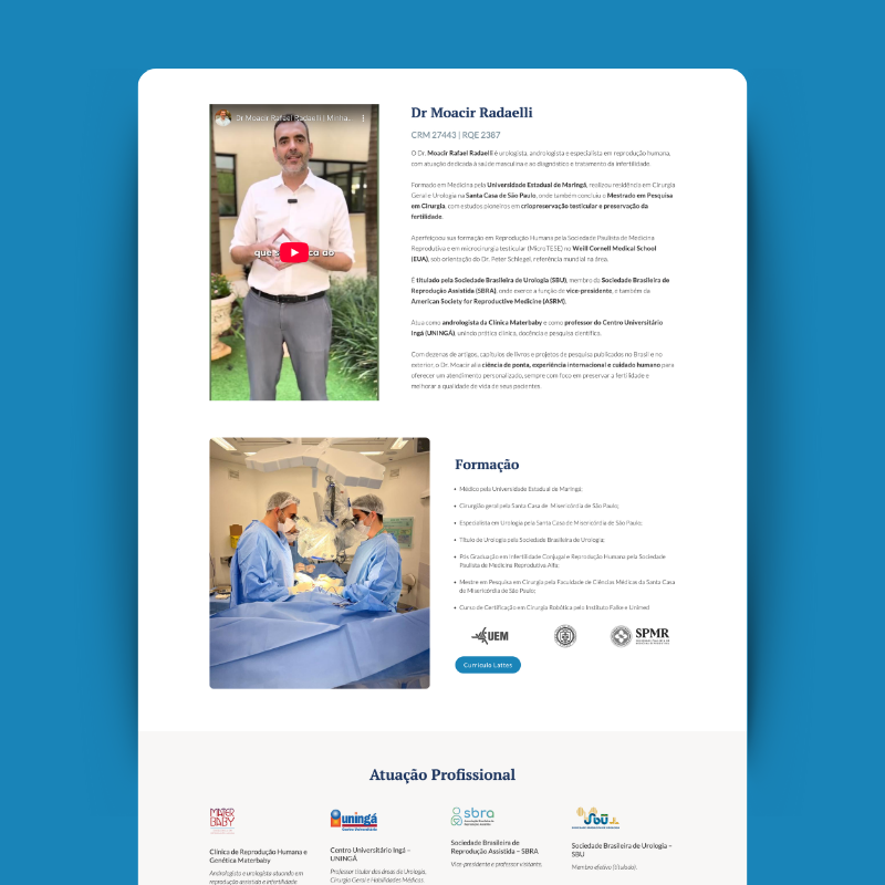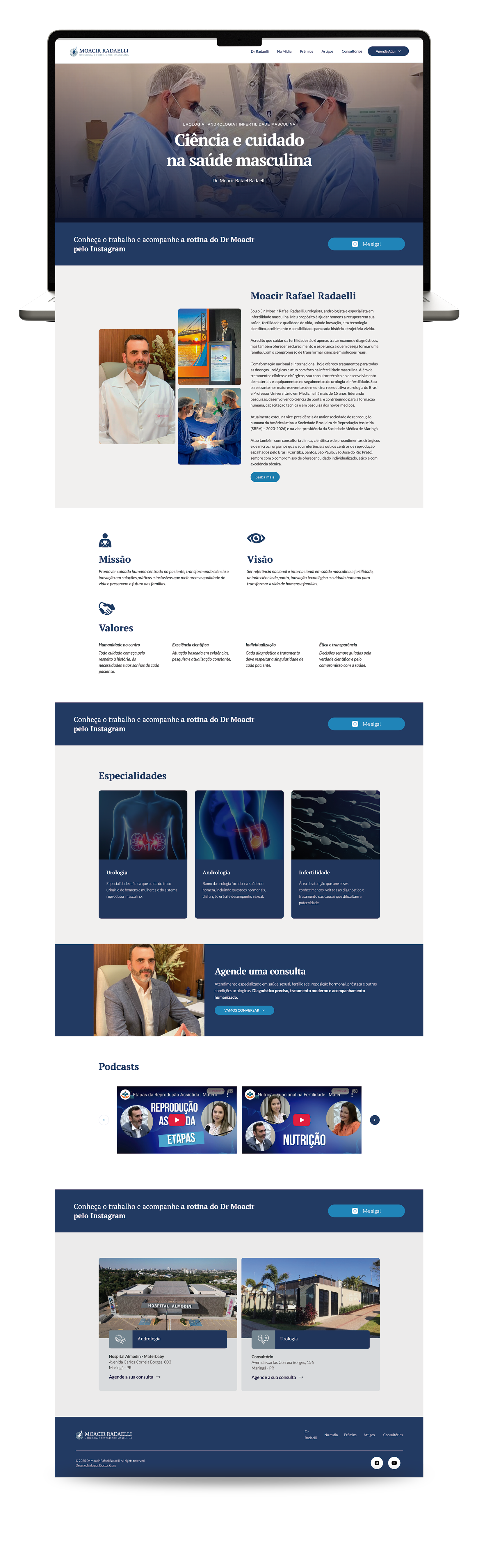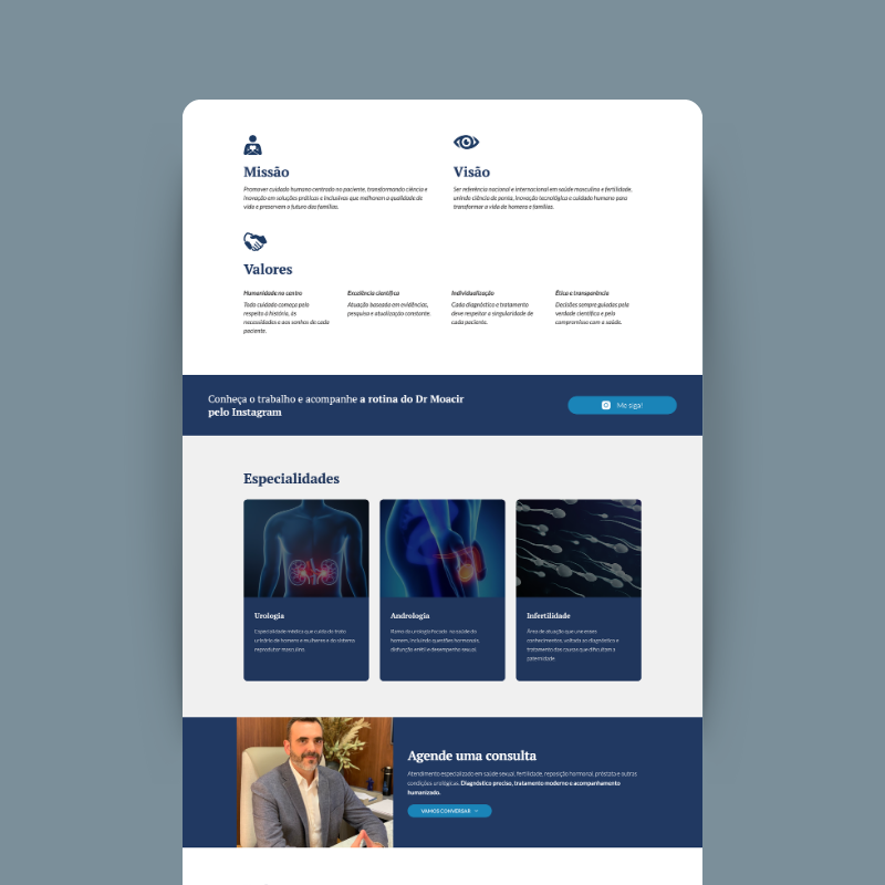 Partimos de uma abordagem estratégica para repensar a presença digital do Dr. Moacir, médico urologista especialista em fertilidade. Reestruturamos a navegação do site para facilitar o acesso às áreas de atuação, tratamentos, informações sobre fertilidade masculina e conteúdos educativos voltados a pacientes e casais em busca de orientação especializada.O design foi desenvolvido para transmitir confiança, acolhimento e excelência médica, com uma identidade visual moderna, paleta sóbria e tipografia clara e objetiva. O novo site posiciona o Dr. Moacir como referência em urologia e fertilidade, destacando sua experiência clínica e oferecendo uma jornada digital intuitiva.